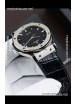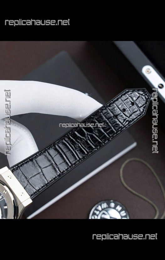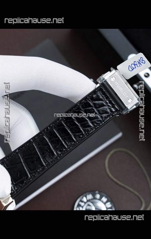 Hybrid Leather/Rubber Strap with Stainless Steel Folding Clasp complete with Hublot Markings and Engravings.