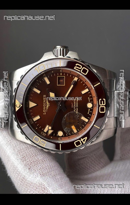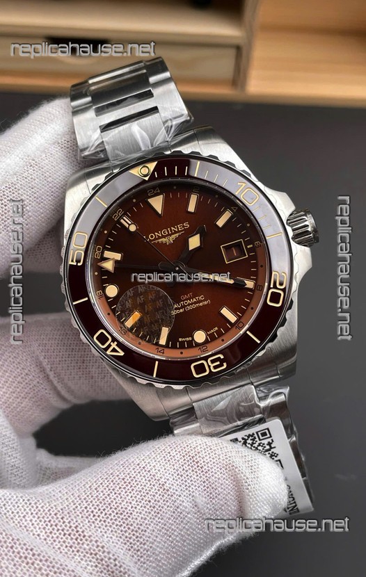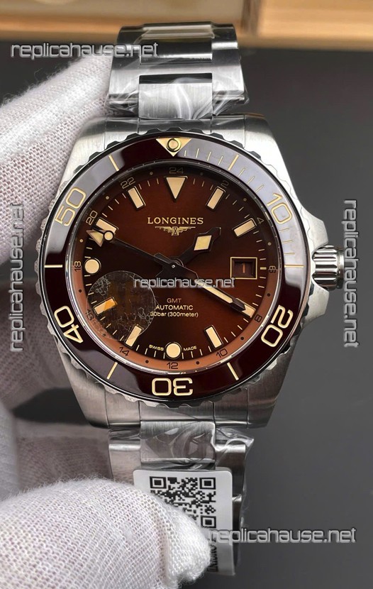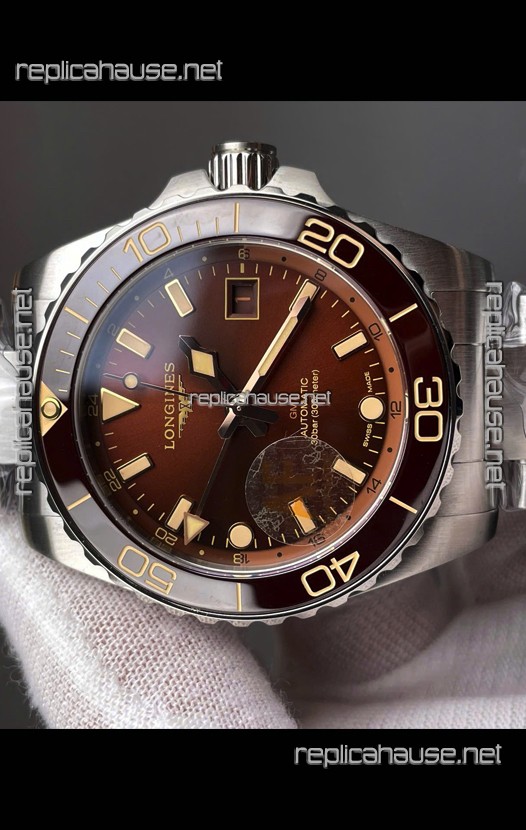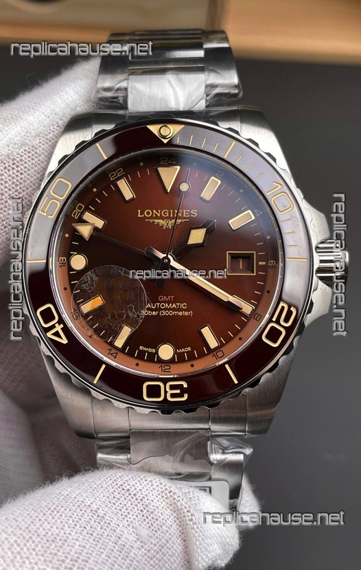 Longines HydroConquest GMT 1:1 Mirror Swiss Replica Watch in Brown Dial Steel Strap