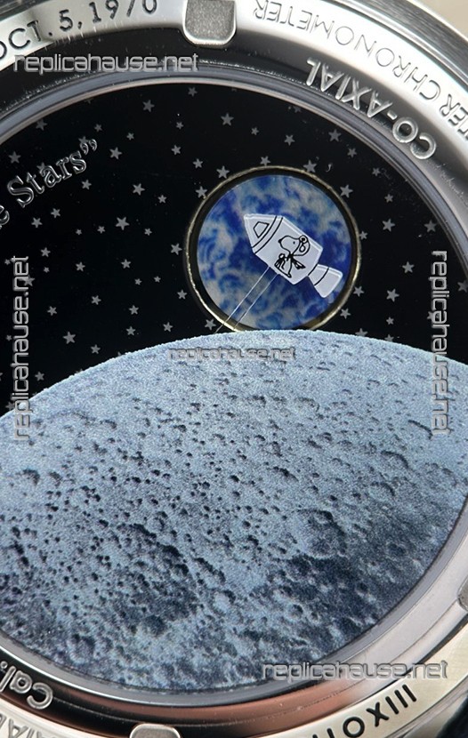 The Globe Located at the rear would rotate and complete one revolution per Minute, the Snoopy on Spaceship would rotate counter clockwise in conjunction to the Chronograph second hand once the Chronograph feature is activated.