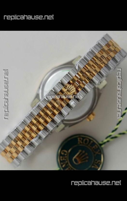 18K Yellow Gold Plating on 904L Stainless Steel Two Tone Strap with New Style Rolesor Deployant Buckle, End links match up Flush with the Case. - A Much Improved Datejust Strap Version