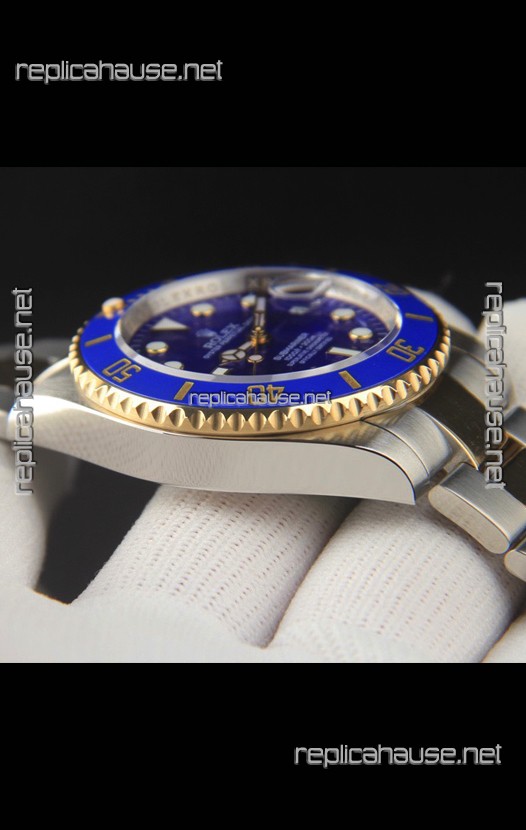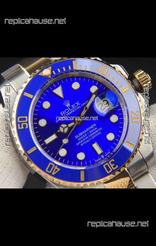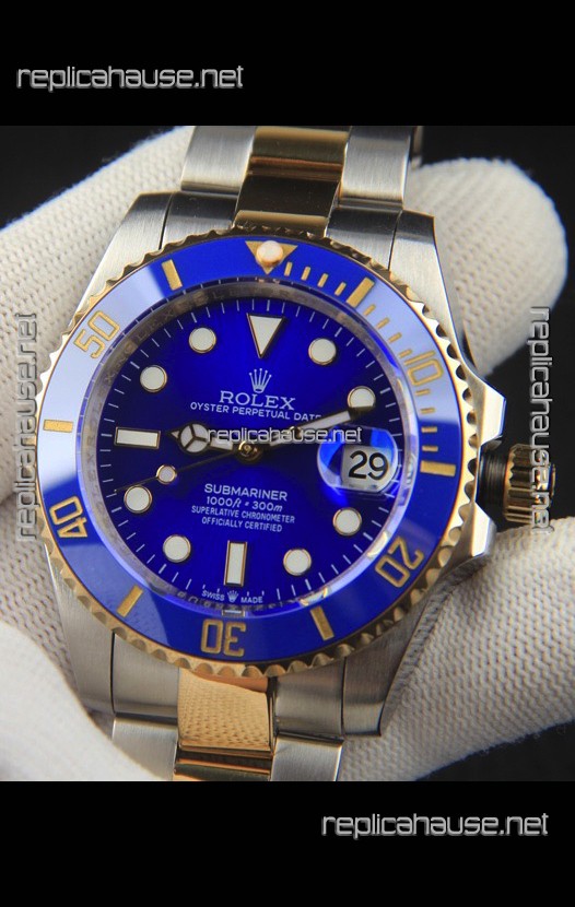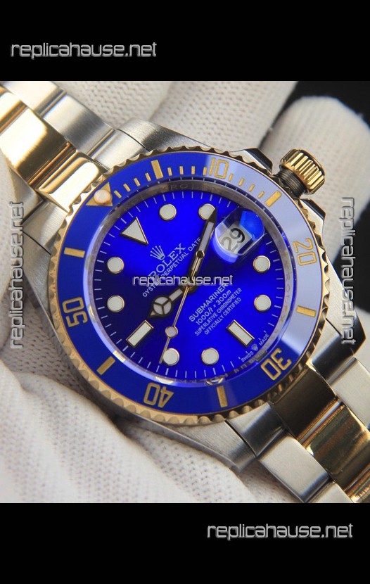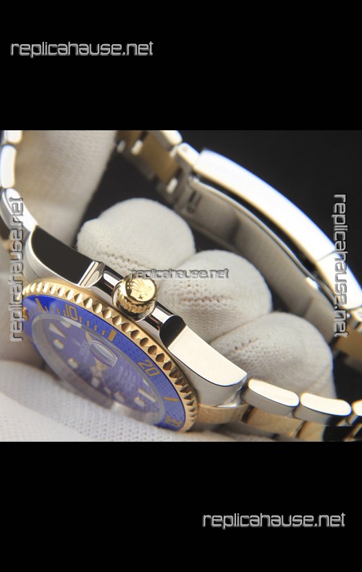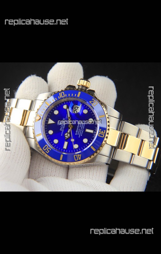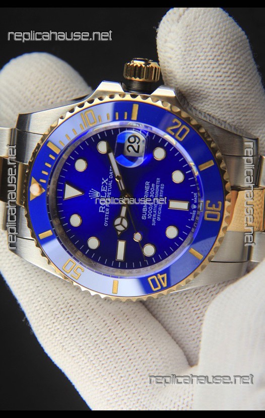 Rolex Submariner Japanese Replica Watch 904L 2 Tone Yellow Gold - Ceramic Bezel in Blue