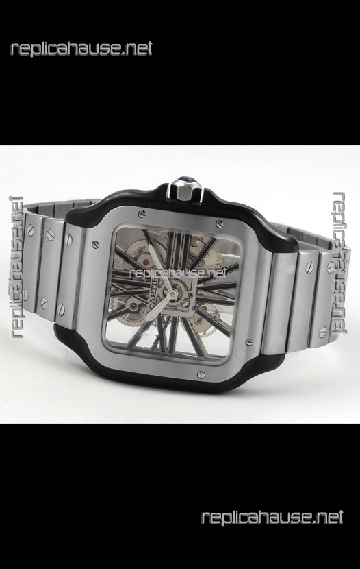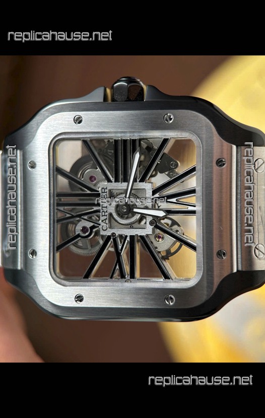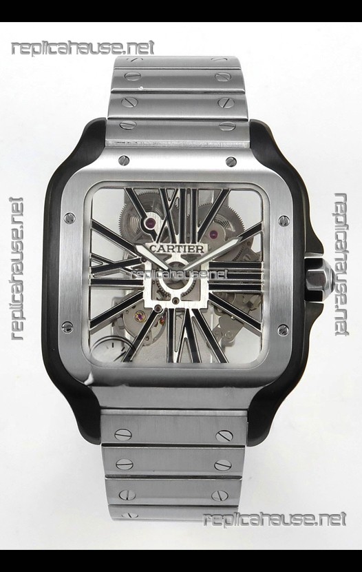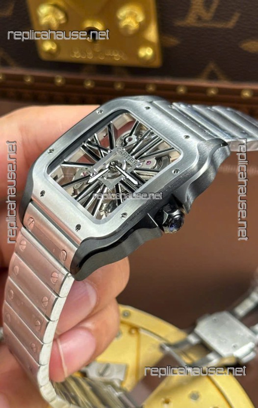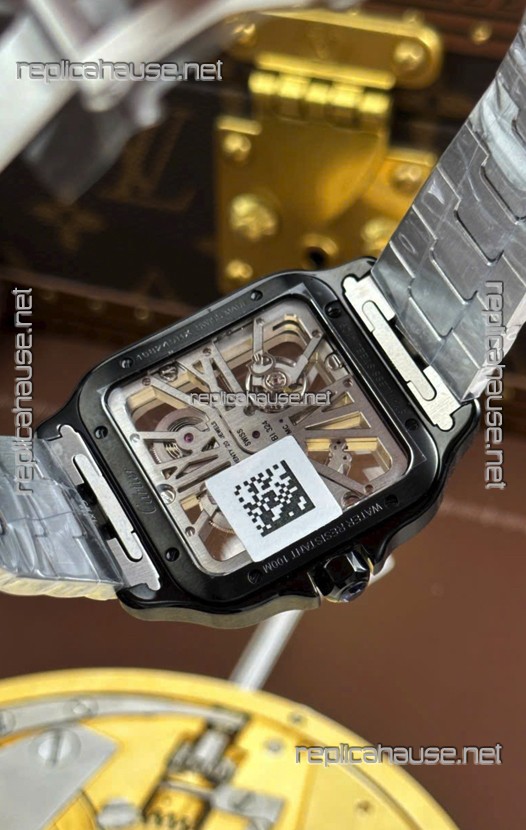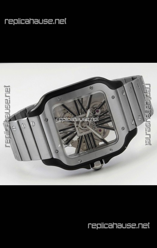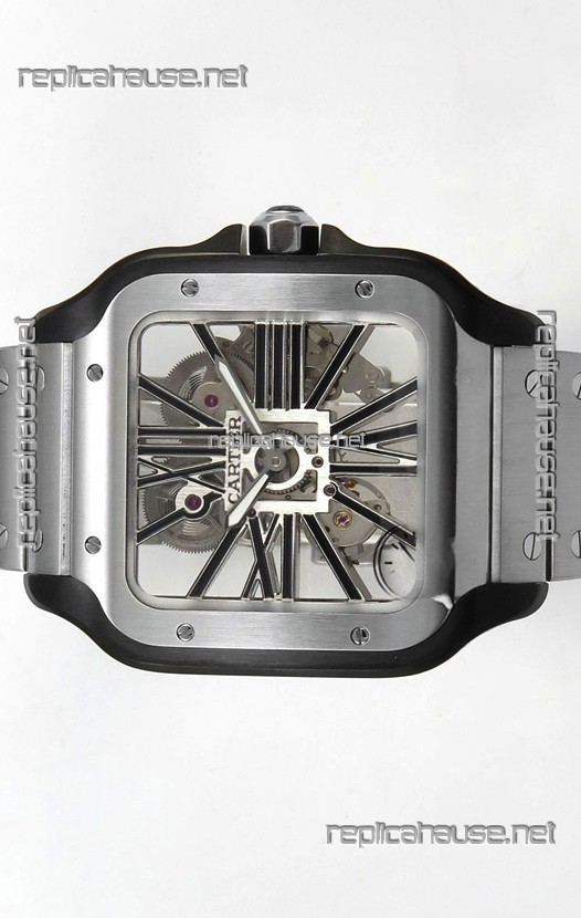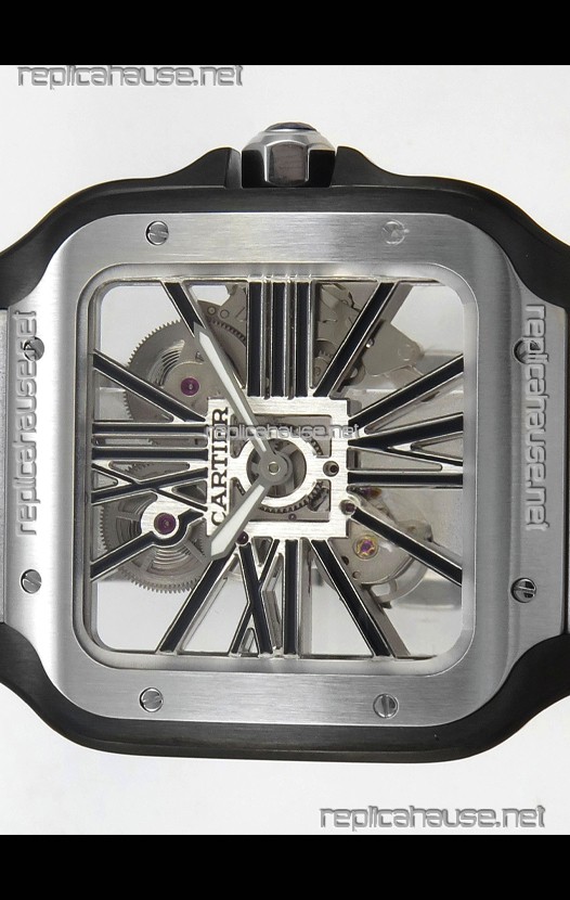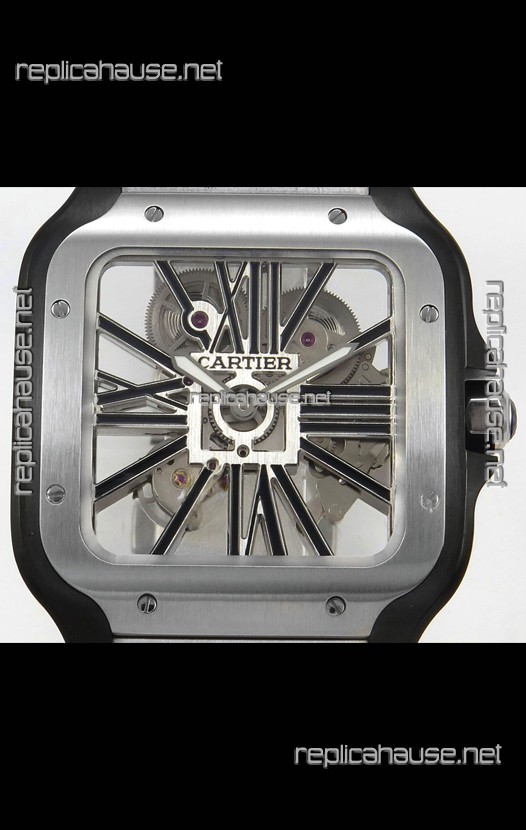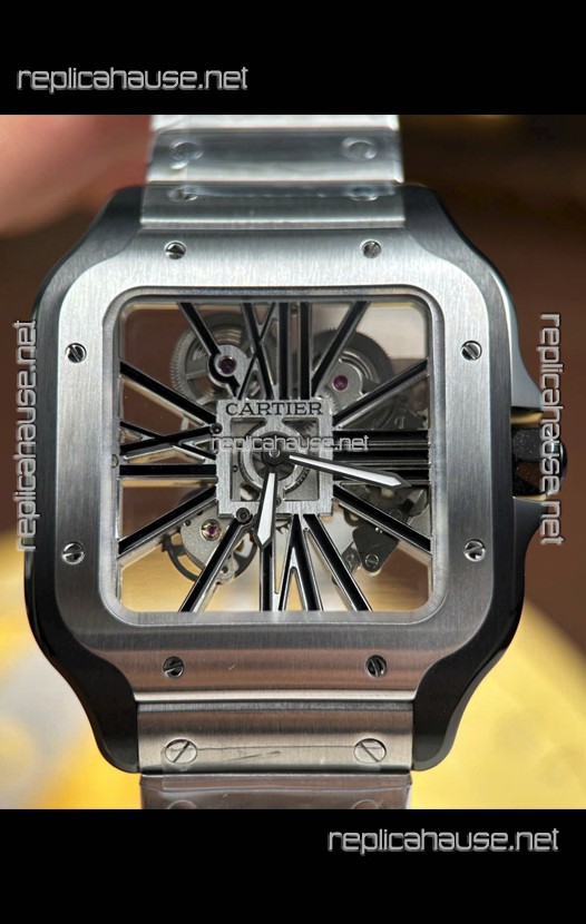 Santos De Cartier Super Clone Watch in Skeleton Dial Brushed DLC Coated Steel Casing Watch