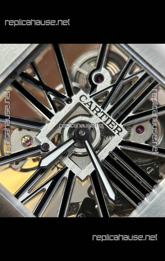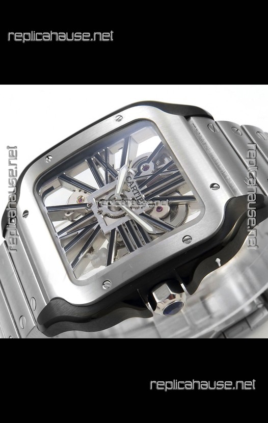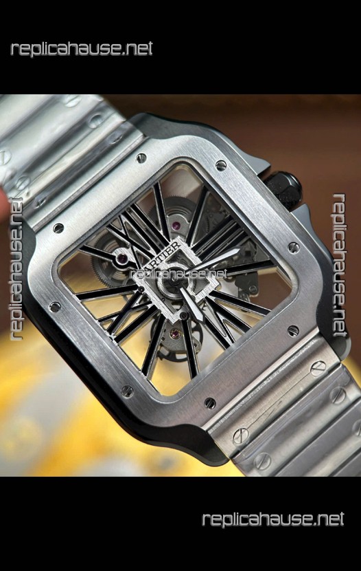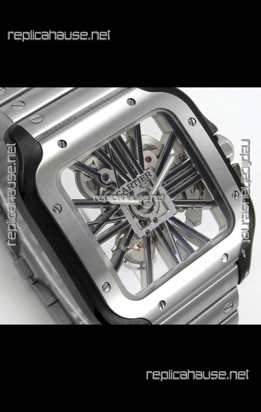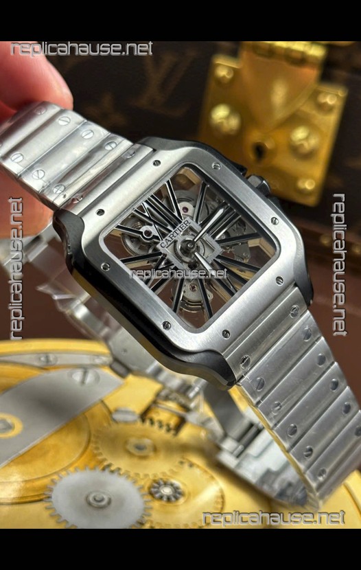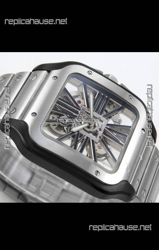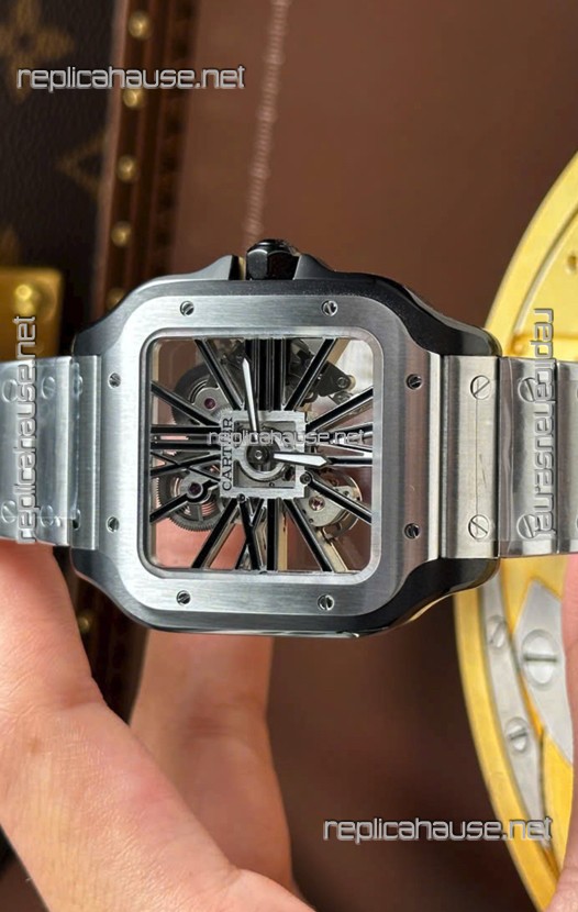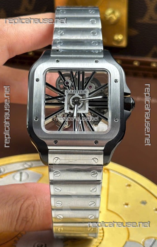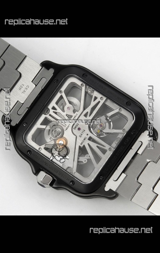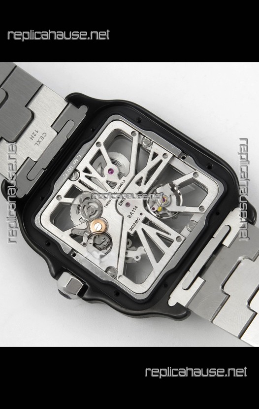 Santos De Cartier Super Clone Watch in Skeleton Dial Brushed DLC Coated Steel Casing Watch